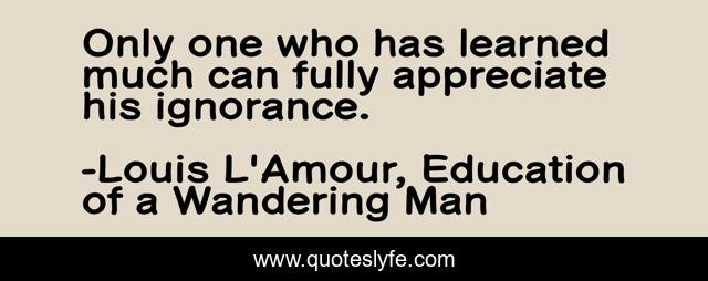 This page presents the quote "Only one who has learned much can fully appreciate his ignorance.". Author of this quote is Louis L'Amour, Education of a Wandering Man. This quote is about education, ignorance, knowledge,.