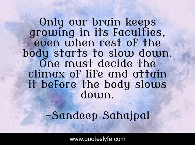 This page presents the quote "Only our brain keeps growing in its faculties, even when rest of the body starts to slow down. One must decide the climax of life and attain it before the body slows down.". Author of this quote is Sandeep Sahajpal. .