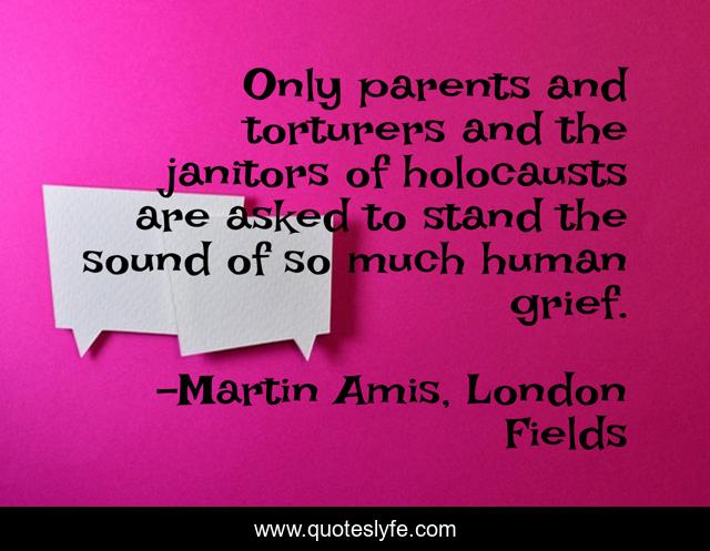 This page presents the quote "Only parents and torturers and the janitors of holocausts are asked to stand the sound of so much human grief.". Author of this quote is Martin Amis, London Fields. This quote is about grief, human-suffering, parents,.