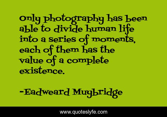 This page presents the quote "Only photography has been able to divide human life into a series of moments, each of them has the value of a complete existence.". Author of this quote is Eadweard Muybridge. This quote is about human-life, moments, photography,.