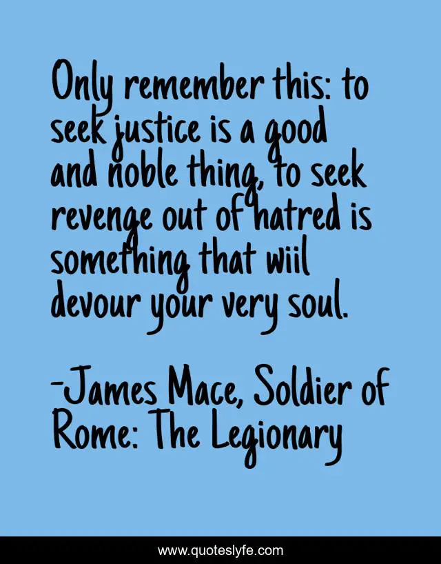 This page presents the quote "Only remember this: to seek justice is a good and noble thing, to seek revenge out of hatred is something that wiil devour your very soul.". Author of this quote is James Mace, Soldier of Rome: The Legionary. This quote is about justice, revenge,.