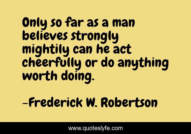 This page presents the quote "Only so far as a man believes strongly mightily can he act cheerfully or do anything worth doing.". Author of this quote is Frederick W. Robertson. This quote is about self, confidence,.