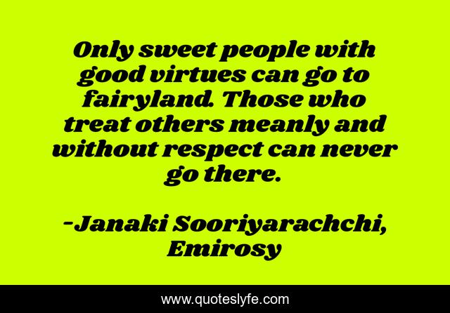 This page presents the quote "Only sweet people with good virtues can go to fairyland. Those who treat others meanly and without respect can never go there.". Author of this quote is Janaki Sooriyarachchi, Emirosy. This quote is about inspiring, children-s-literature, good-advice,.