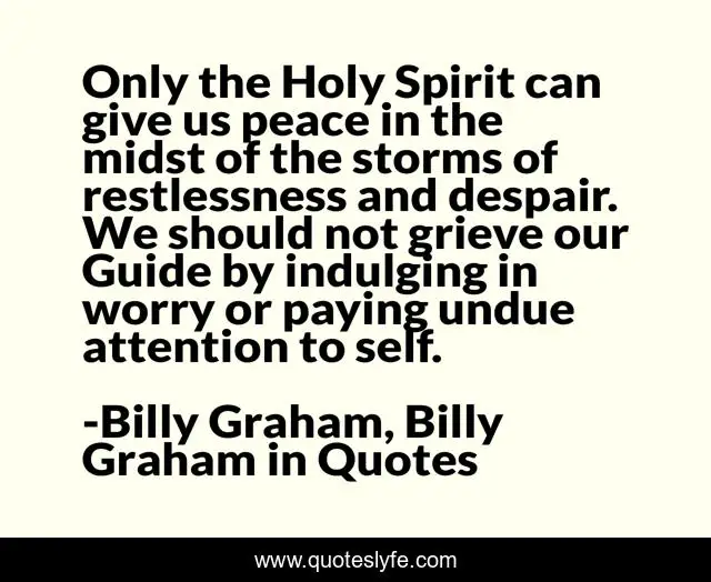 This page presents the quote "Only the Holy Spirit can give us peace in the midst of the storms of restlessness and despair. We should not grieve our Guide by indulging in worry or paying undue attention to self.". Author of this quote is Billy Graham, Billy Graham in Quotes. This quote is about worry, billy-graham,.