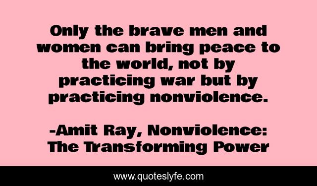This page presents the quote "Only the brave men and women can bring peace to the world, not by practicing war but by practicing nonviolence.". Author of this quote is Amit Ray, Nonviolence: The Transforming Power. This quote is about nonviolence, brave, nobel-peace-prize, peace-movement, peacefulness, peace, courage-in-life, brave-men, world-peace,.