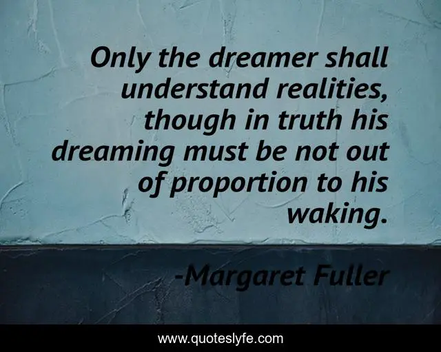 This page presents the quote "Only the dreamer shall understand realities, though in truth his dreaming must be not out of proportion to his waking.". Author of this quote is Margaret Fuller. This quote is about understand, truth, dreamer,.