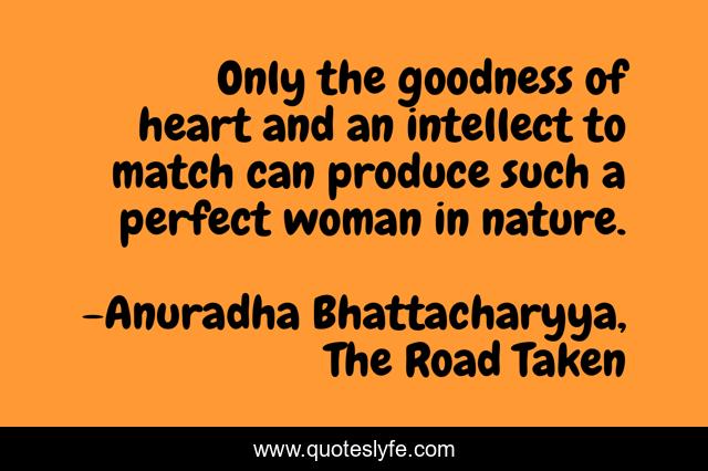 This page presents the quote "Only the goodness of heart and an intellect to match can produce such a perfect woman in nature.". Author of this quote is Anuradha Bhattacharyya, The Road Taken. This quote is about woman-s-strength, woman-s-character, woman, goodness,.