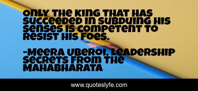 This page presents the quote "Only the king that has succeeded in subduing his senses is competent to resist his foes.". Author of this quote is Meera Uberoi, Leadership Secrets From The Mahabharata. This quote is about leadership, wisdom,.