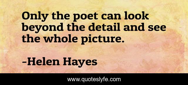This page presents the quote "Only the poet can look beyond the detail and see the whole picture.". Author of this quote is Helen Hayes. This quote is about poet, picture,.