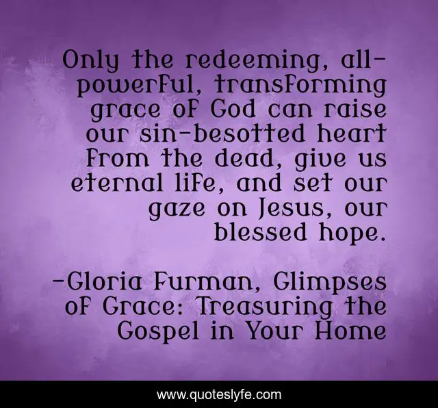 This page presents the quote "Only the redeeming, all-powerful, transforming grace of God can raise our sin-besotted heart from the dead, give us eternal life, and set our gaze on Jesus, our blessed hope.". Author of this quote is Gloria Furman, Glimpses of Grace: Treasuring the Gospel in Your Home. This quote is about pg57, grace, eternal-life, jesus, sin, hope,.