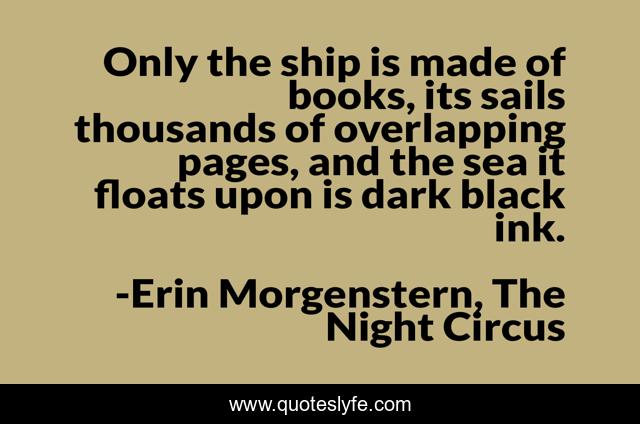 This page presents the quote "Only the ship is made of books, its sails thousands of overlapping pages, and the sea it floats upon is dark black ink.". Author of this quote is Erin Morgenstern, The Night Circus. This quote is about ships, books, the-night-circus,.