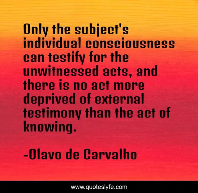 This page presents the quote "Only the subject's individual consciousness can testify for the unwitnessed acts, and there is no act more deprived of external testimony than the act of knowing.". Author of this quote is Olavo de Carvalho. .