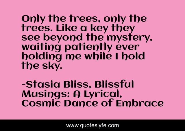 This page presents the quote "Only the trees, only the trees. Like a key they see beyond the mystery, waiting patiently ever holding me while I hold the sky.". Author of this quote is Stasia Bliss, Blissful Musings: A Lyrical, Cosmic Dance of Embrace. This quote is about mystery, sky, trees, nature,.