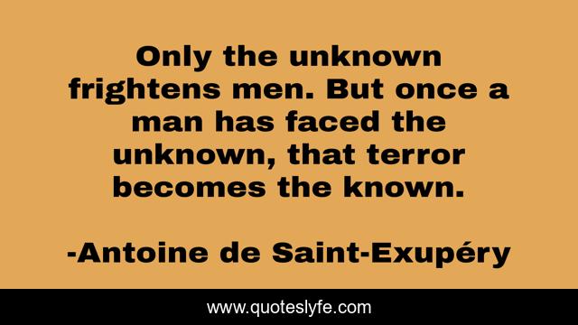 This page presents the quote "Only the unknown frightens men. But once a man has faced the unknown, that terror becomes the known.". Author of this quote is Antoine de Saint-Exupéry. This quote is about unknown, fear,.