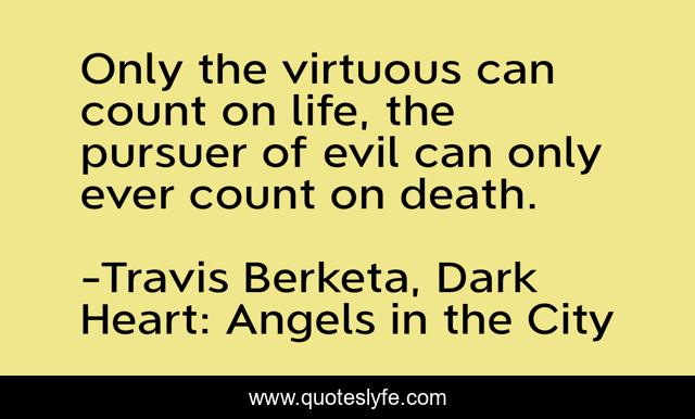 This page presents the quote "Only the virtuous can count on life, the pursuer of evil can only ever count on death.". Author of this quote is Travis Berketa, Dark Heart: Angels in the City. This quote is about mystery, life, death, angel, vice, evil, murder, virtue, inspirational,.