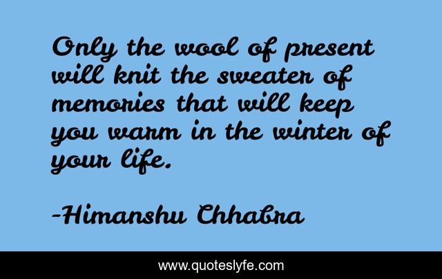 This page presents the quote "Only the wool of present will knit the sweater of memories that will keep you warm in the winter of your life.". Author of this quote is Himanshu Chhabra. This quote is about winter-of-life, memories, warm, present,.