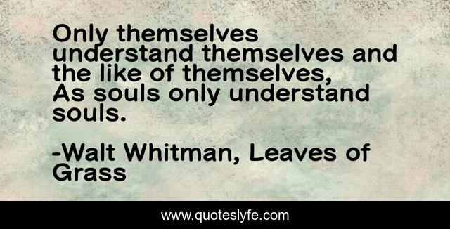 This page presents the quote "Only themselves understand themselves and the like of themselves, As souls only understand souls.". Author of this quote is Walt Whitman, Leaves of Grass. This quote is about self, life, self-awareness, souls, perfectionism,.