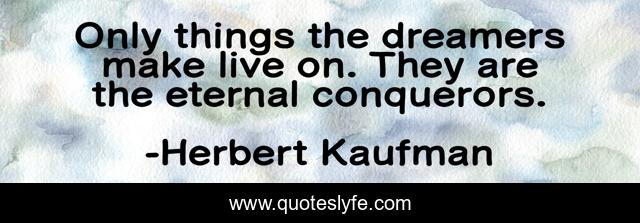 This page presents the quote "Only things the dreamers make live on. They are the eternal conquerors.". Author of this quote is Herbert Kaufman. This quote is about things, live, dreamers,.