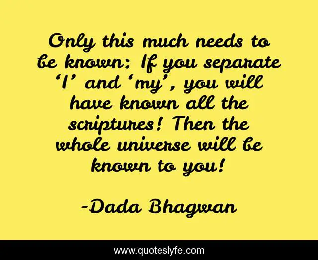 This page presents the quote "Only this much needs to be known: If you separate ‘I’ and ‘my’, you will have known all the scriptures! Then the whole universe will be known to you!". Author of this quote is Dada Bhagwan. This quote is about universe, spiritual, scriptures,.