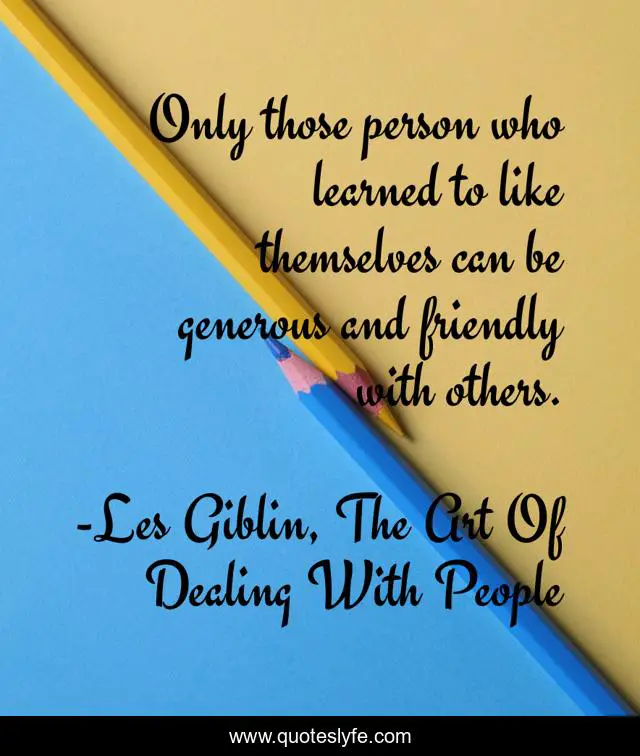 This page presents the quote "Only those person who learned to like themselves can be generous and friendly with others.". Author of this quote is Les Giblin, The Art Of Dealing With People. This quote is about enthusiasm, psychology, inspirational,.