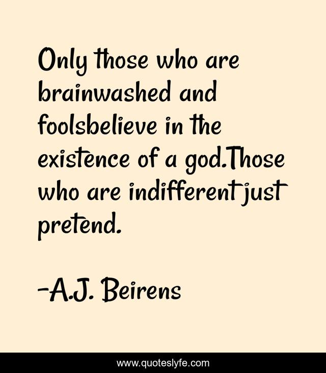 This page presents the quote "Only those who are brainwashed and foolsbelieve in the existence of a god.Those who are indifferent just pretend.". Author of this quote is A.J. Beirens. This quote is about brainwishing, atheist, atheism, pretending, god, fools, indifference,.
