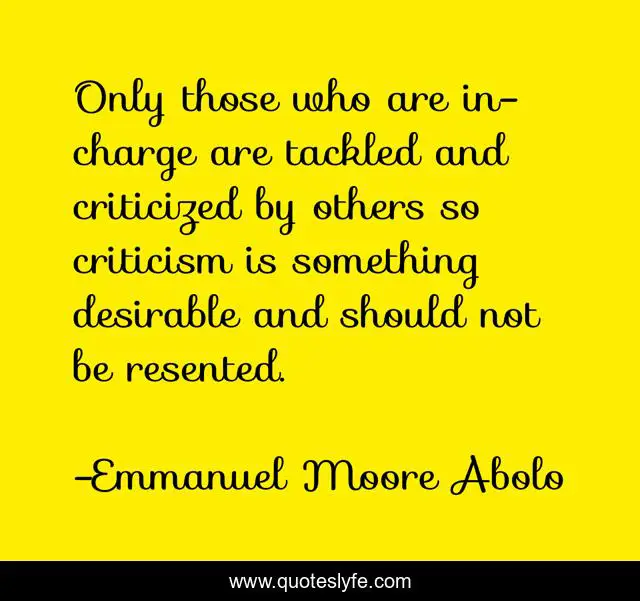 This page presents the quote "Only those who are in-charge are tackled and criticized by others so criticism is something desirable and should not be resented.". Author of this quote is Emmanuel Moore Abolo. This quote is about desire, criticisms, resent,.