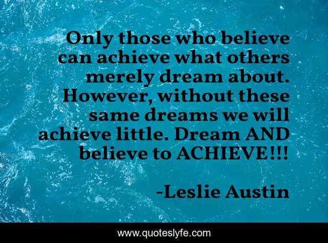 This page presents the quote "Only those who believe can achieve what others merely dream about. However, without these same dreams we will achieve little. Dream AND believe to ACHIEVE!!!". Author of this quote is Leslie Austin. This quote is about quote, author, enthusiasm, inspirational, sayings,.