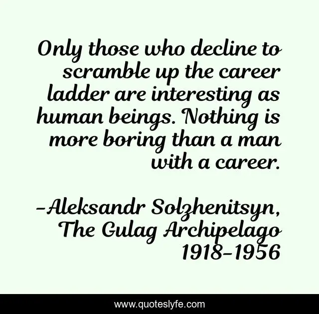 This page presents the quote "Only those who decline to scramble up the career ladder are interesting as human beings. Nothing is more boring than a man with a career.". Author of this quote is Aleksandr Solzhenitsyn, The Gulag Archipelago 1918-1956. This quote is about career, vocation, corporate,.