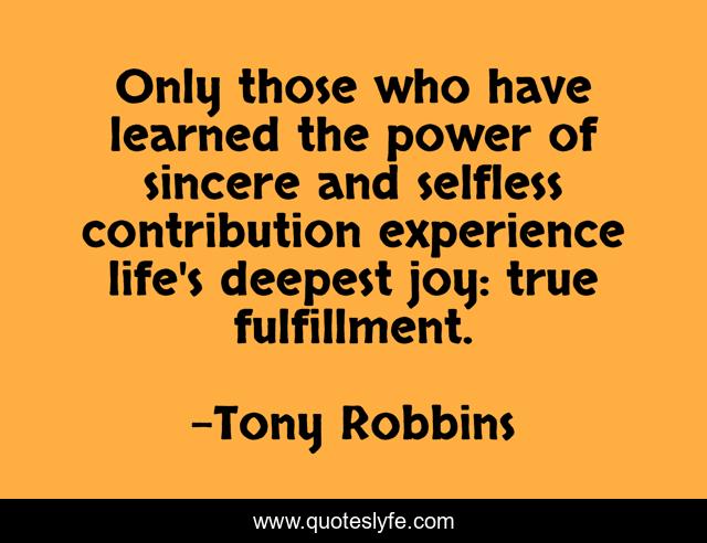 This page presents the quote "Only those who have learned the power of sincere and selfless contribution experience life's deepest joy: true fulfillment.". Author of this quote is Tony Robbins. This quote is about life, experience, power,.