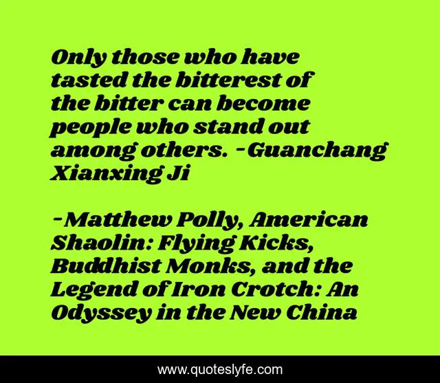 This page presents the quote "Only those who have tasted the bitterest of the bitter can become people who stand out among others. -Guanchang Xianxing Ji". Author of this quote is Matthew Polly, American Shaolin: Flying Kicks, Buddhist Monks, and the Legend of Iron Crotch: An Odyssey in the New China. This quote is about living, life, success, chinese, people, positive, motivational, confidence, china,.