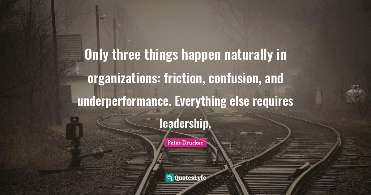 This page presents the quote "Only three things happen naturally in organizations: friction, confusion, and underperformance. Everything else requires leadership.". Author of this quote is Peter Drucker. This quote is about three things, friction, leadership, confusion, excellence, organization,.