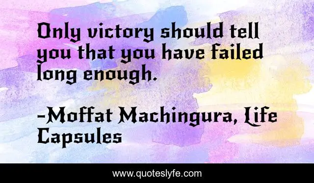This page presents the quote "Only victory should tell you that you have failed long enough.". Author of this quote is Moffat Machingura, Life Capsules. This quote is about failure, determination, victory, success,.