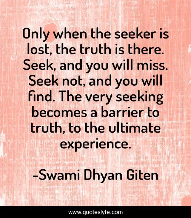 This page presents the quote "Only when the seeker is lost, the truth is there. Seek, and you will miss. Seek not, and you will find. The very seeking becomes a barrier to truth, to the ultimate experience.". Author of this quote is Swami Dhyan Giten. This quote is about desire, life, light, love, moksha, freedom, awareness, nirvana, spirituality,.