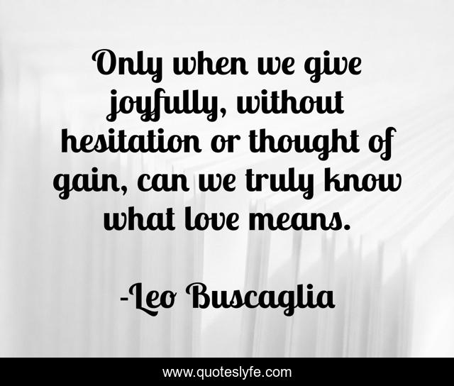 This page presents the quote "Only when we give joyfully, without hesitation or thought of gain, can we truly know what love means.". Author of this quote is Leo Buscaglia. This quote is about enthusiasm, love, inspirational, affection,.