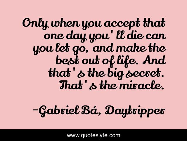 This page presents the quote "Only when you accept that one day you'll die can you let go, and make the best out of life. And that's the big secret. That's the miracle.". Author of this quote is Gabriel Bá, Daytripper. This quote is about life, meaning-of-life, life-and-death, miracle,.