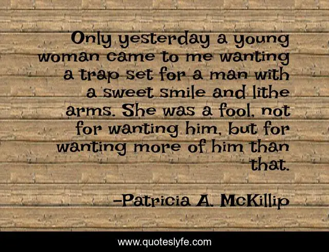 This page presents the quote "Only yesterday a young woman came to me wanting a trap set for a man with a sweet smile and lithe arms. She was a fool, not for wanting him, but for wanting more of him than that.". Author of this quote is Patricia A. McKillip. This quote is about heartache, fantasy, love, affection,.