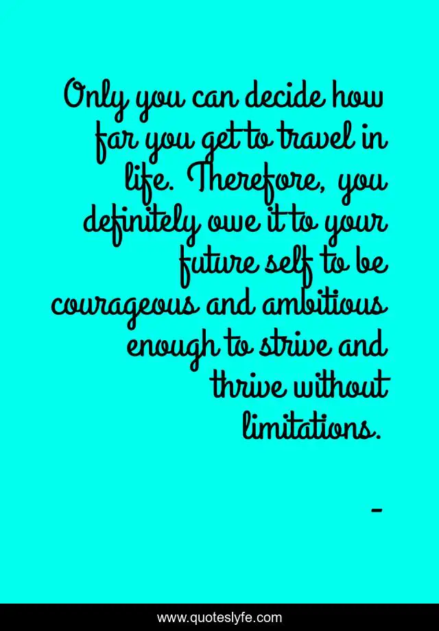 This page presents the quote "Only you can decide how far you get to travel in life. Therefore, you definitely owe it to your future self to be courageous and ambitious enough to strive and thrive without limitations.". Author of this quote is . This quote is about be-courageous, edmond-mbiaka, strive-without-limitations, your-future-self, stay-ambitious, thrive, strive,.