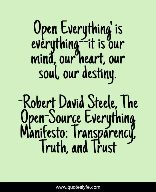 "Robert David Steele, The Open-Source Everything Manifesto: Transparency, Truth, and Trust Quotes." Quoteslyfe.com, 2025. Sun. 07 Dec. 2025. <https://www.quoteslyfe.com/quote/Open-Everything-is-everything-it-is-our-200242>.