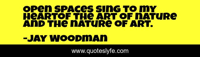 This page presents the quote "Open spaces sing to my heartof the art of nature and the nature of art.". Author of this quote is Jay Woodman. This quote is about heart, art, nature, art-of-nature, nature-of-art, sing, nature-s-beauty,.