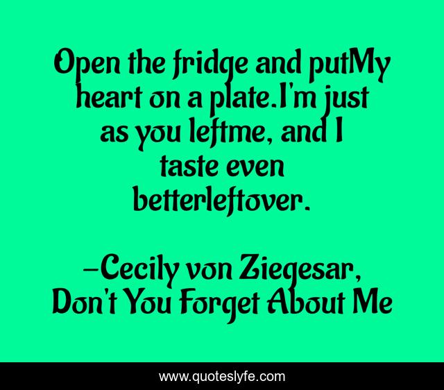 "Cecily von Ziegesar, Don't You Forget About Me Quotes." Quoteslyfe.com, 2025. Fri. 05 Dec. 2025. <https://www.quoteslyfe.com/quote/Open-the-fridge-and-putMy-heart-on-24842>.