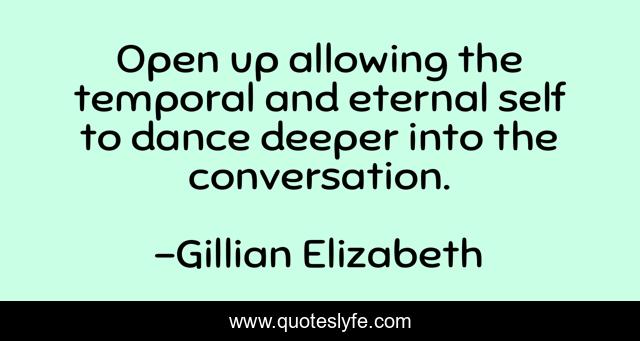 This page presents the quote "Open up allowing the temporal and eternal self to dance deeper into the conversation.". Author of this quote is Gillian Elizabeth. This quote is about enthusiasm, consciousness, soul, inspirational, higher-self,.