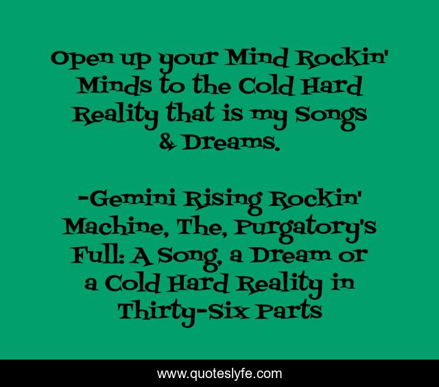 "Gemini Rising Rockin' Machine, The, Purgatory's Full: A Song, a Dream or a Cold Hard Reality in Thirty-Six Parts Quotes." Quoteslyfe.com, 2025. Sun. 07 Dec. 2025. <https://www.quoteslyfe.com/quote/Open-up-your-Mind-Rockin-Minds-to-157452>.