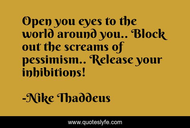 This page presents the quote "Open you eyes to the world around you.. Block out the screams of pessimism.. Release your inhibitions!". Author of this quote is Nike Thaddeus. This quote is about change, self-improvement, optimism, inspiration,.