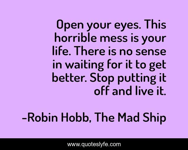This page presents the quote "Open your eyes. This horrible mess is your life. There is no sense in waiting for it to get better. Stop putting it off and live it.". Author of this quote is Robin Hobb, The Mad Ship. This quote is about eyes, see, mess, life, live, truth, time, wait,.