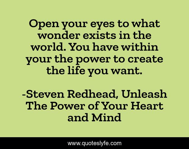 This page presents the quote "Open your eyes to what wonder exists in the world. You have within your the power to create the life you want.". Author of this quote is Steven Redhead, Unleash The Power of Your Heart and Mind. This quote is about world, create, life, power, wonder,.