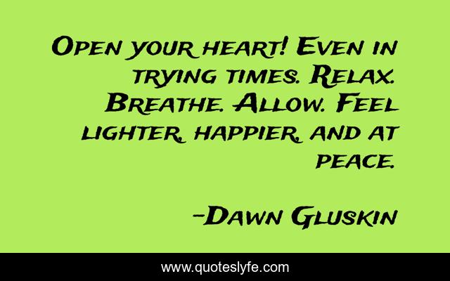 This page presents the quote "Open your heart! Even in trying times. Relax. Breathe. Allow. Feel lighter, happier, and at peace.". Author of this quote is Dawn Gluskin. This quote is about breathe, heart, love, relax, feel, peace, open, affection, happy,.