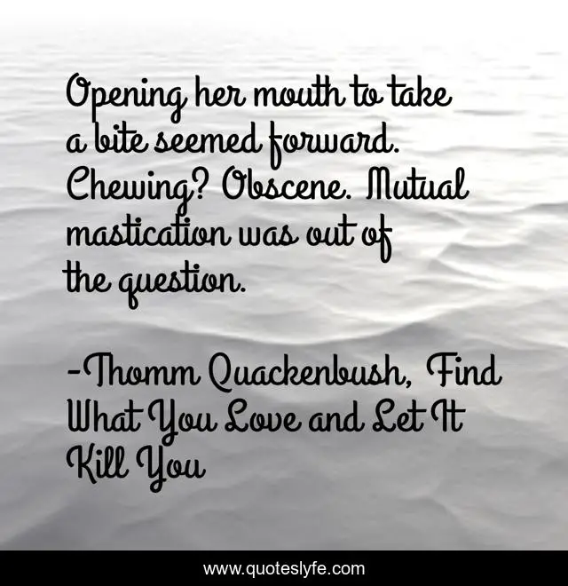 This page presents the quote "Opening her mouth to take a bite seemed forward. Chewing? Obscene. Mutual mastication was out of the question.". Author of this quote is Thomm Quackenbush, Find What You Love and Let It Kill You. This quote is about food, chew, eating, eat, chewing,.