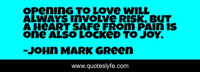 This page presents the quote "Opening to love will always involve risk, but a heart safe from pain is one also locked to joy.". Author of this quote is John Mark Green. This quote is about heart, love, risk, vulnerability, quotes-about-love, pain, affection,.