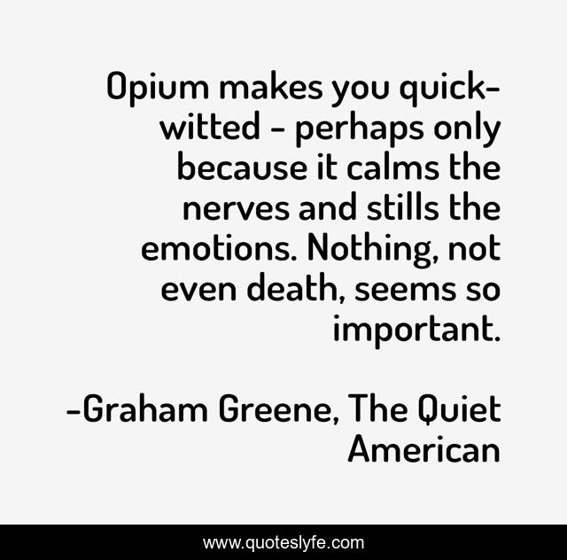 This page presents the quote "Opium makes you quick-witted - perhaps only because it calms the nerves and stills the emotions. Nothing, not even death, seems so important.". Author of this quote is Graham Greene, The Quiet American. This quote is about death-and-dying, opium,.