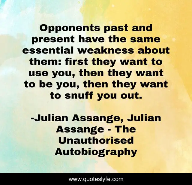This page presents the quote "Opponents past and present have the same essential weakness about them: first they want to use you, then they want to be you, then they want to snuff you out.". Author of this quote is Julian Assange, Julian Assange - The Unauthorised Autobiography. This quote is about leaks, hacking, computers, journalism,.